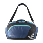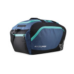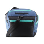 Blue& Black colourblocked travel duffel bag, has two short handles, and one detachable and adjustable shoulder strap