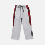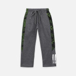 - Grey melange track pants with contrast camouflage printed panel detail, has an elasticated waistband with drawstring closure and one zippered pocket