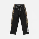- Black track pants with contrast camouflage printed panel detail, has an elasticated waistband with drawstring closure and one zippered pocket