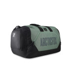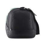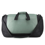 Green & Black printed travel duffel bag, has two short handles, and one detachable and adjustable shoulder strap