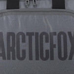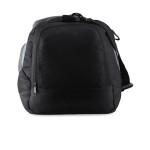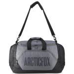 Grey & Black printed travel duffel bag, has two short handles, and one detachable and adjustable shoulder strap