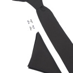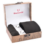 This accessory gift set consists of a tie, a pocket square, and a pair of cufflinks Black solid tie Black solid pocket square A pair of silver-toned and white circular cufflinks, secured with bullet back closure Comes in a signature Blacksmith case