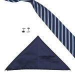 This accessory gift set consists of a tie, a pocket square and lapel pin Blue patterned tie Blue solid pocket square Blue and silver-toned cufflins Comes in a signature Alvaro Castagnino case
