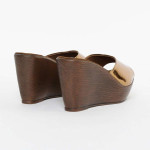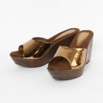 "This pair of platforms showcases a meticulously designed sheen strap, wedge heels, and a peep-toed construction.