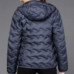 Navy blue solid reflective strip puffer jacket, has a hooded, 2 pockets ,has a zip closure, long sleeves, straight hemline, polyester lining